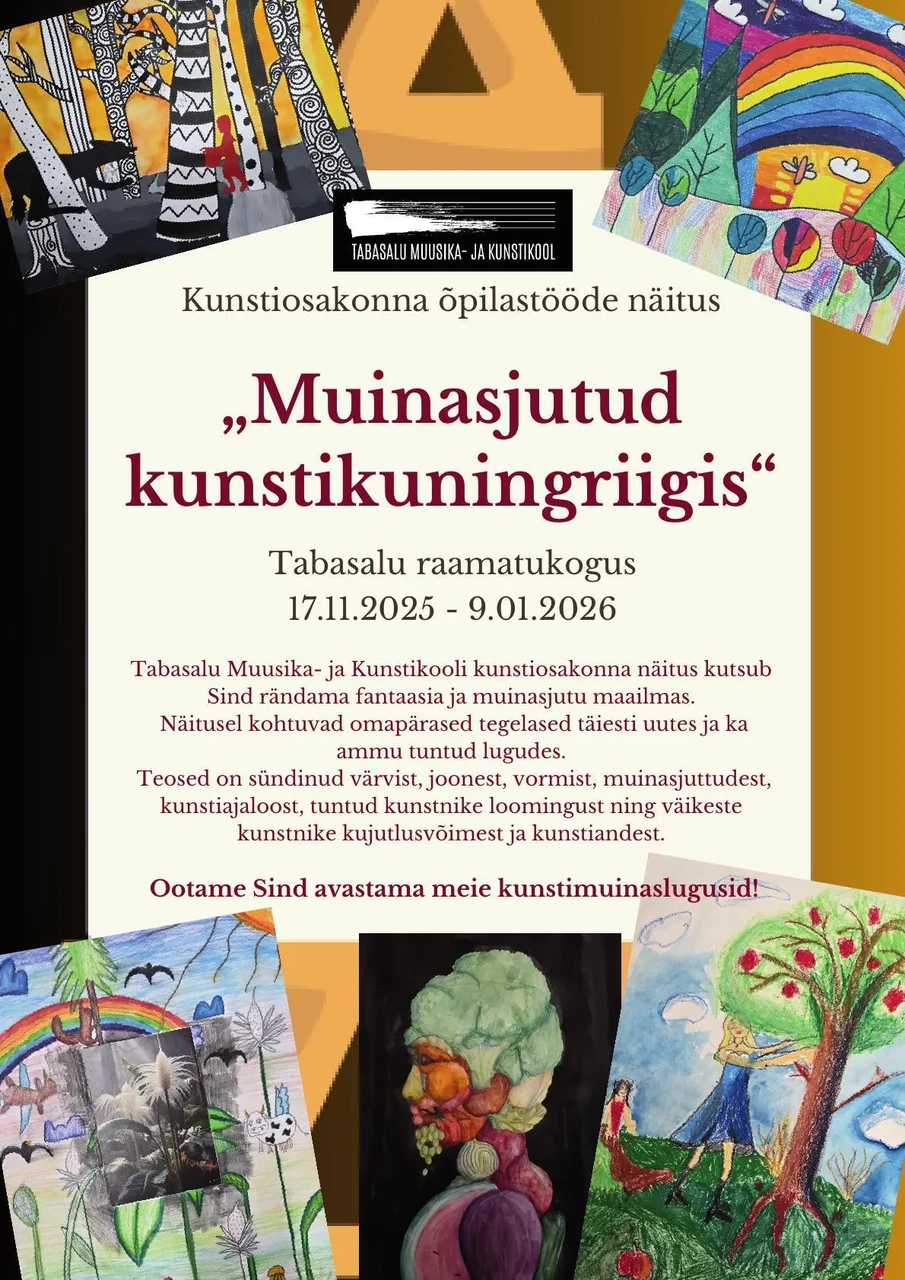 Tabasalu Muusika- ja Kunstikooli kunstiosakonna näitus kutsub Sind rändama fantaasia ja muinasjutu maailmas. Näitusel kohtuvad omapärased tegelased täiesti uutes ja ka ammu tuntud lugudes. Teosed on sündinud värvist, joonest, vormist, muinasjuttudest, kunstiajaloost, tuntud kunstnike loomingust ning väikeste kunstnike kujutlusvõimest ja kunstiandest.