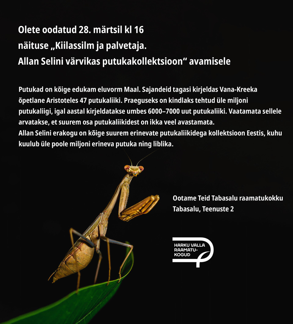 28. märtsist kuni 11. septembrini Tabasalu raamatukogus.Putukad on kõige edukam eluvorm Maal. Sajandeid tagasi kirjeldas Vana-Kreeka õpetlane Aristoteles 47 putukaliiki. Praeguseks on kindlaks tehtud üle miljoni putukaliigi, igal aastal kirjeldatakse umbes 6000–7000 uut putukaliiki. Vaatamata sellele arvatakse, et suurem osa putukaliikidest on ikka veel avastamata.