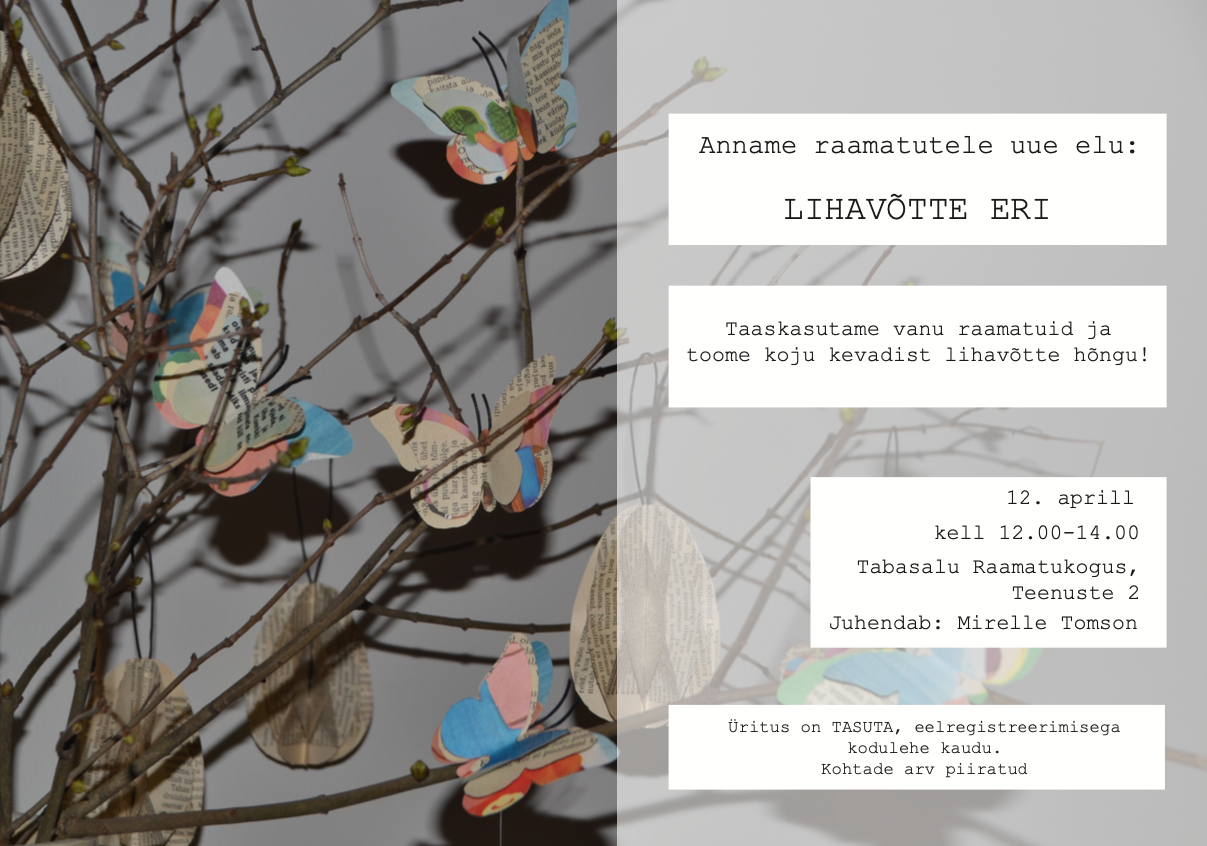 Registreerumine on lõppenud. Kohad on täis.Ootame teid laupäeval, 12. aprillil kell 12.00 Tabasalu raamatukokku, kus toimub paberehete valmistamise töötuba.