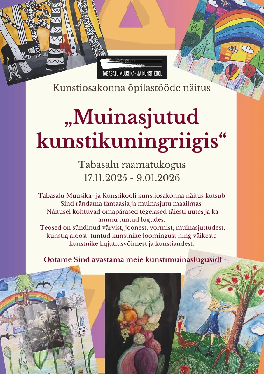 Tabasalu raamatukogus saab alates 17. novembrist vaadata kunstiosakonna õpilastööde näitust „Muinasjutud kunstikuningriigis“. Pidulik avamine toimub 19. novembril kell 15:30.