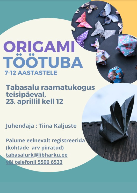 Tiina Kaljuste juhendamisel toimub Tabasalu raamatukogus 7.- 12. aastastele origami töötuba.