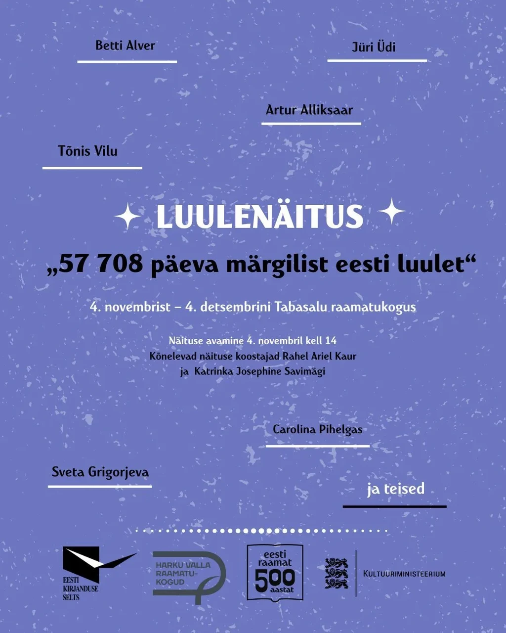 Tabasalu raamatukogus eksponeeritakse 4. novembrist – 4. detsembrini eesti luuleraamatutele pühendatud näitust „57 708 päeva märgilist eesti luulet“, mille on koostanud noored kirjandusteadlased Rahel Ariel Kaur, Katrinka Josephine Savimägi ja Kerstin Vestel.