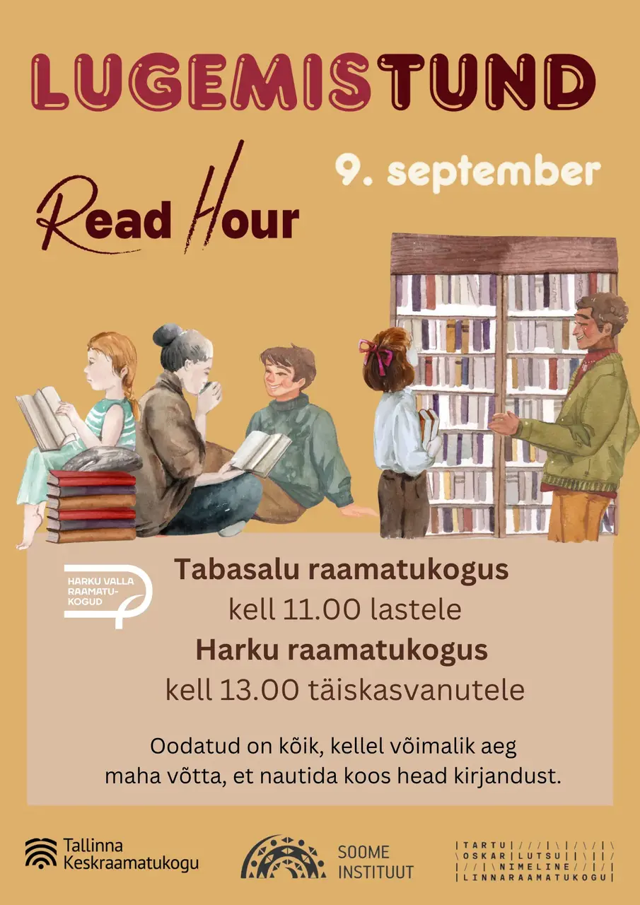 9. septembril Tabasalus raamtukogus kell 11.00 ja Harku raamatukogus kell 13.00.Lugemine on tähtis! Rahvusvaheline kirjaoskuse päev väärib tähistamist! Ka Eesti on ühinenud Soomes 2019. aastal algatatud ReadHour ehk Lugemistunni kampaaniaga, mille eesmärgiks on lugemist propageerida. Harku valla raamatukogudes toimuvad Lugemistunni sündmused 9. septembril. Tabasalu lugemistund algusega kell 11.00 on suunatud lastele, Harku kutsub külla lugemishuvilisi täiskasvanuid kell 13.00.