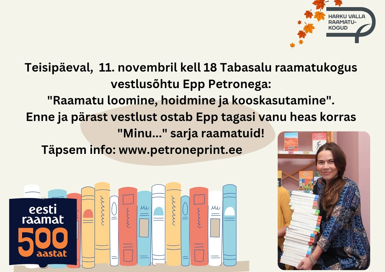 Teisipäeval, 11. novembril kell 18 Tabasalu raamatukogus vestlusõhtu Epp Petronega: "Raamatu loomine, hoidmine ja kooskasutamine".